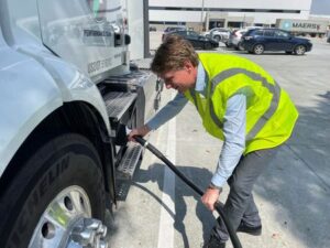 FILE PHOTO: Henrik Holland, global head of Prologis Mobility, plugs a Volvo electric semi into a newly installed charger at a trucking company yard in Los Angeles, California, U.S., March 13, 2023. REUTERS/Lisa Baertlein